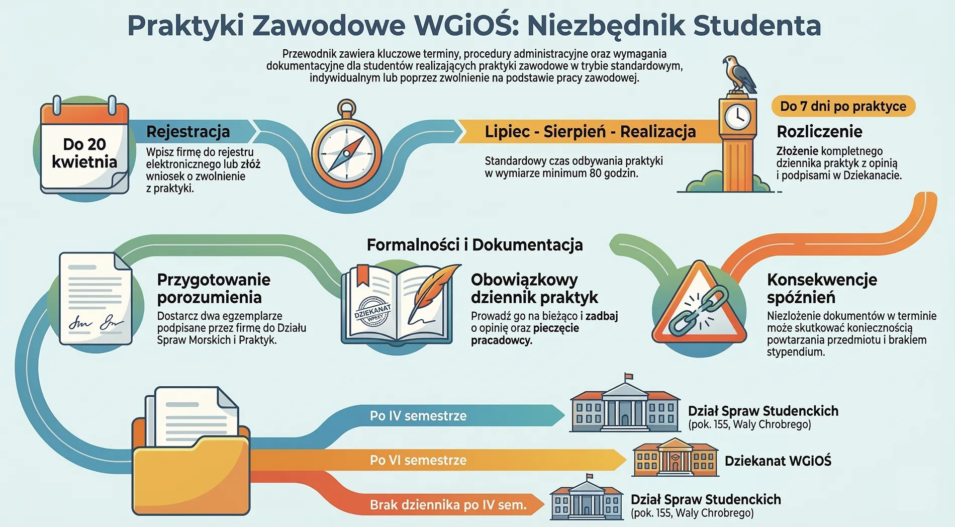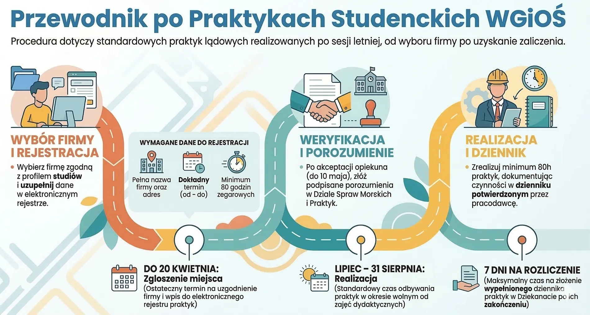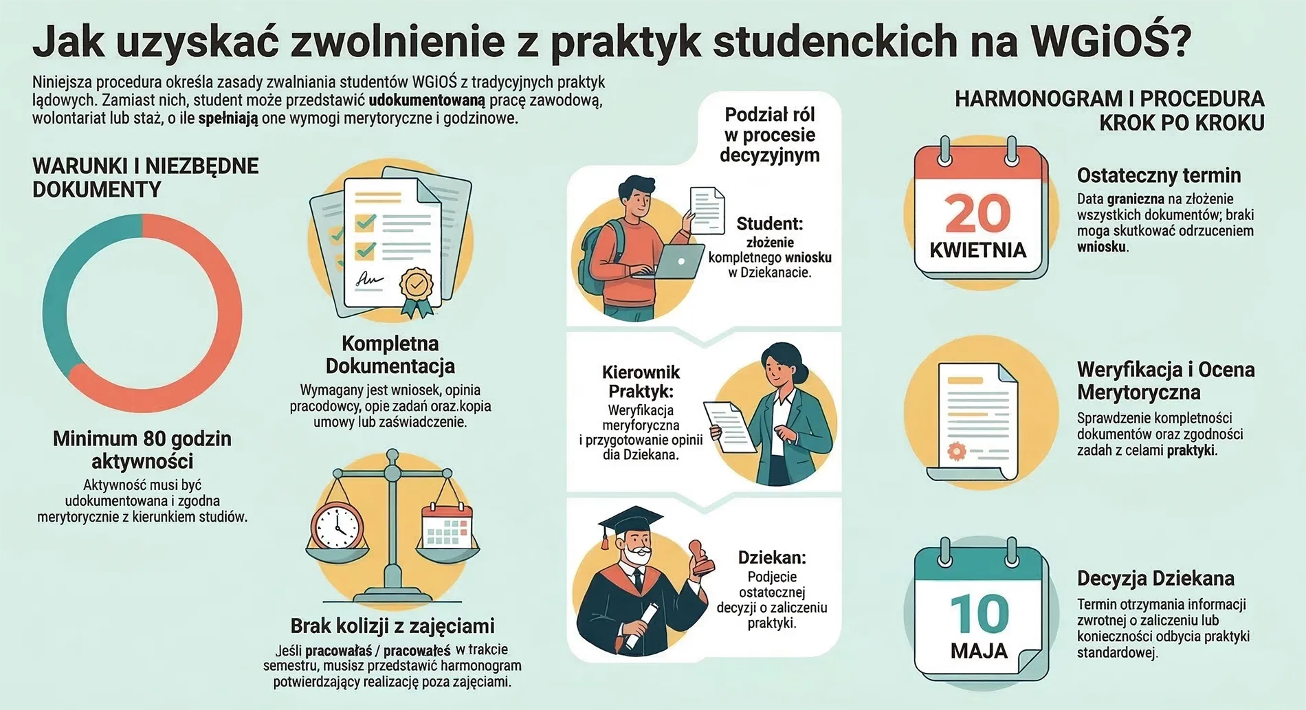 | Wpis do rejestru lub złożenie kompletnego wniosku o zwolnienie. | Informacja o akceptacji lub decyzja w sprawie zwolnienia. | Standardowy okres realizacji praktyki. | Złożenie kompletnego dziennika praktyk w Dziekanacie WGiOŚ. |