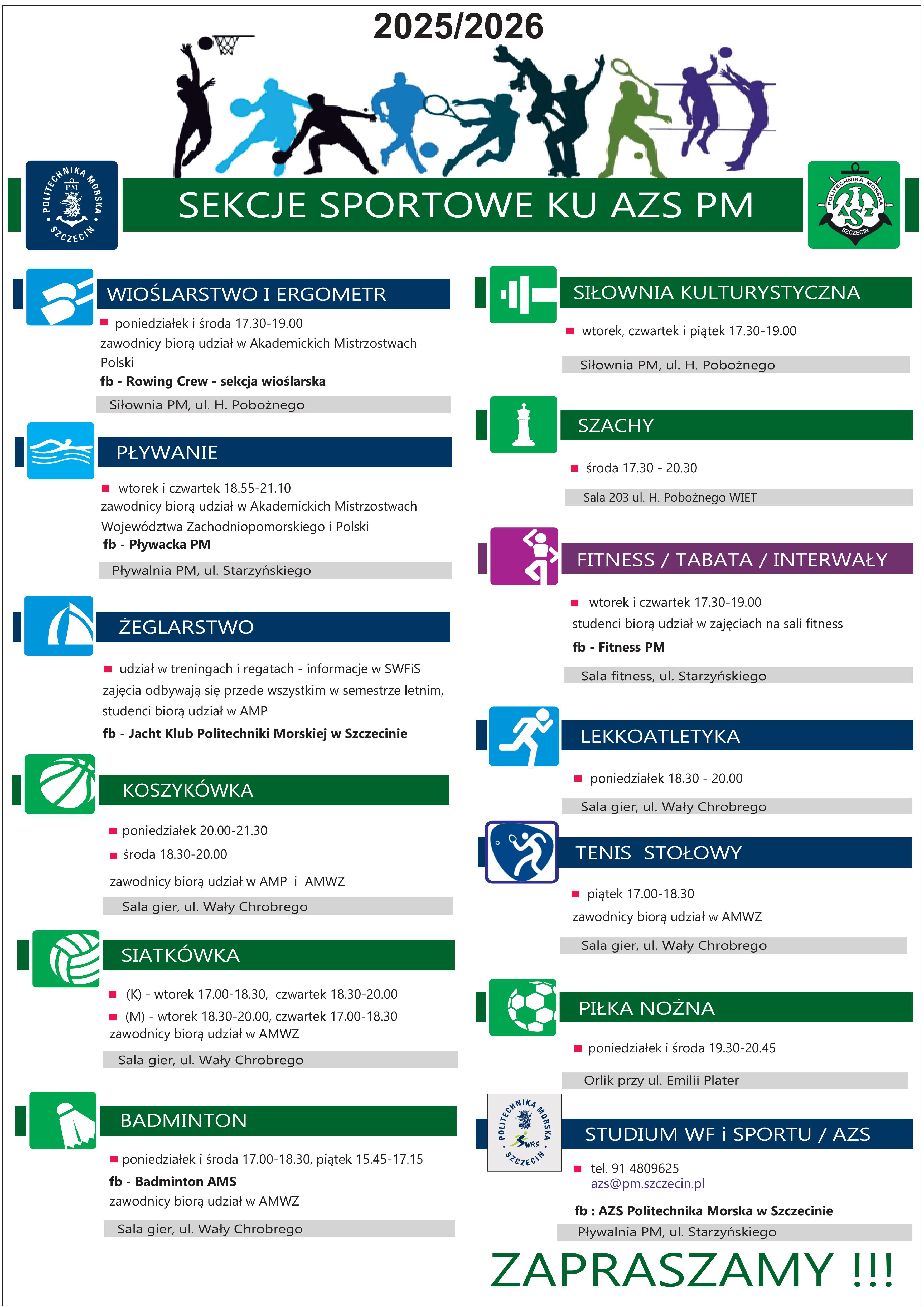 - zaawansowana Panów ( treningi we wtorki 18.30 - 20.00 i czwartki w godz. 17.00 - 18.30), którzy biorą udział w rywalizacji międzyuczelnianej, a także w rozgrywkach Szczecińskiej Amatorskiej Ligi Piłki Siatkowej;